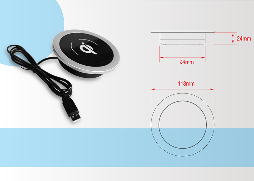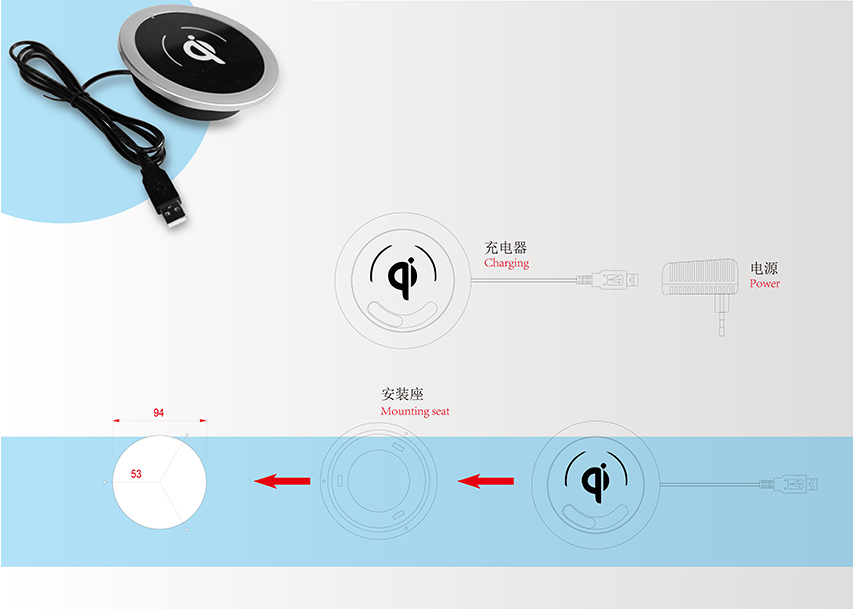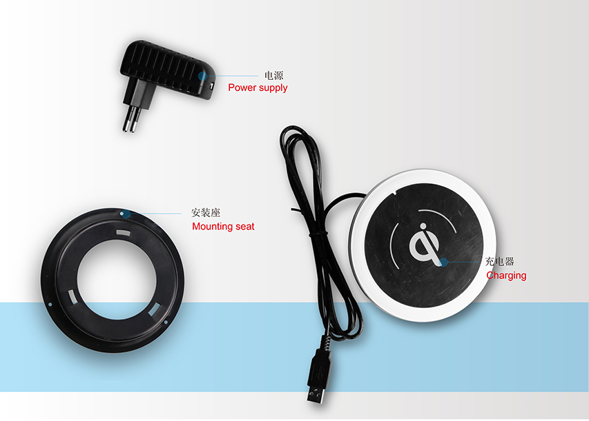 1.无线充电,适用可无线充电的移动设备。2.配DC5V2A电源,美规欧规中规可选
