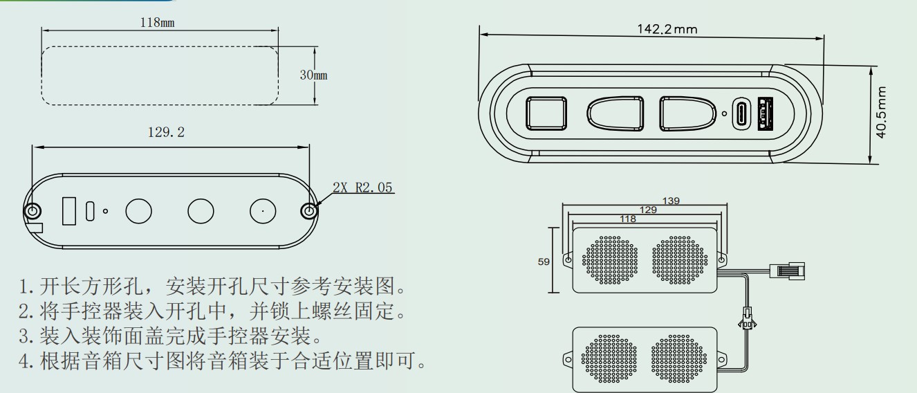 4.根据音箱尺寸图将音箱装于合适位置即可(蓝牙音箱可选配)