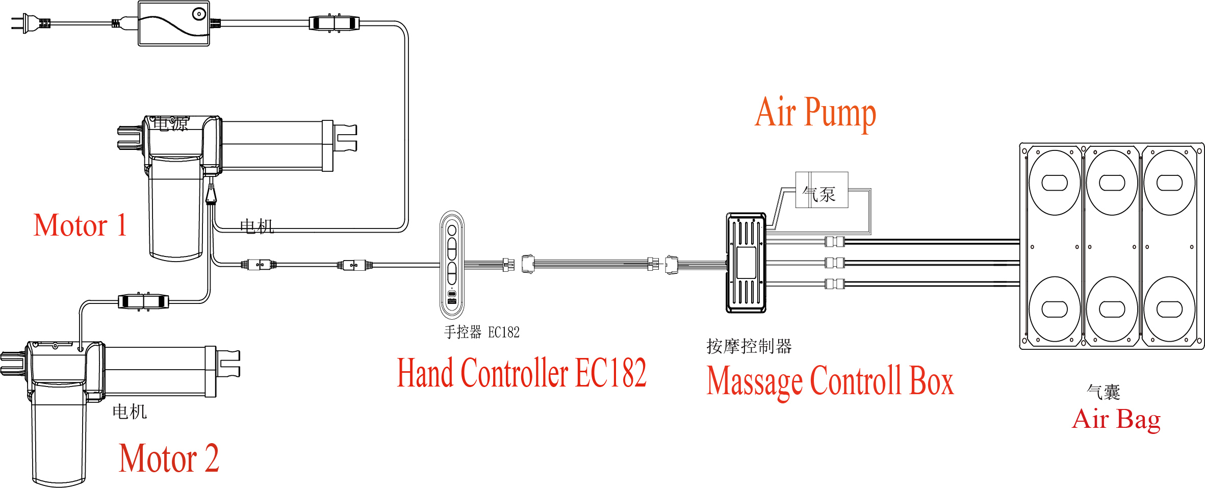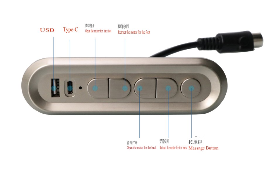 4.背部收回:长按背部收回按键,背部电机收回到行程最小,松开停止。