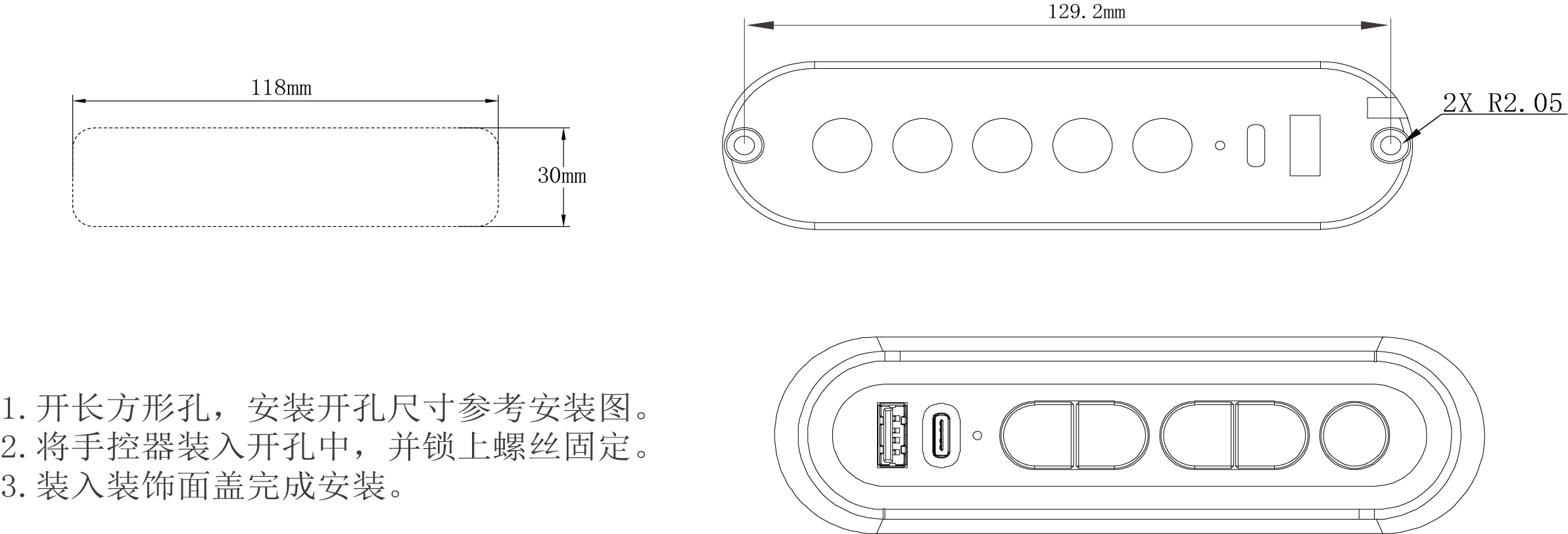 1.开长方形孔,安装开孔尺寸参考安装图。