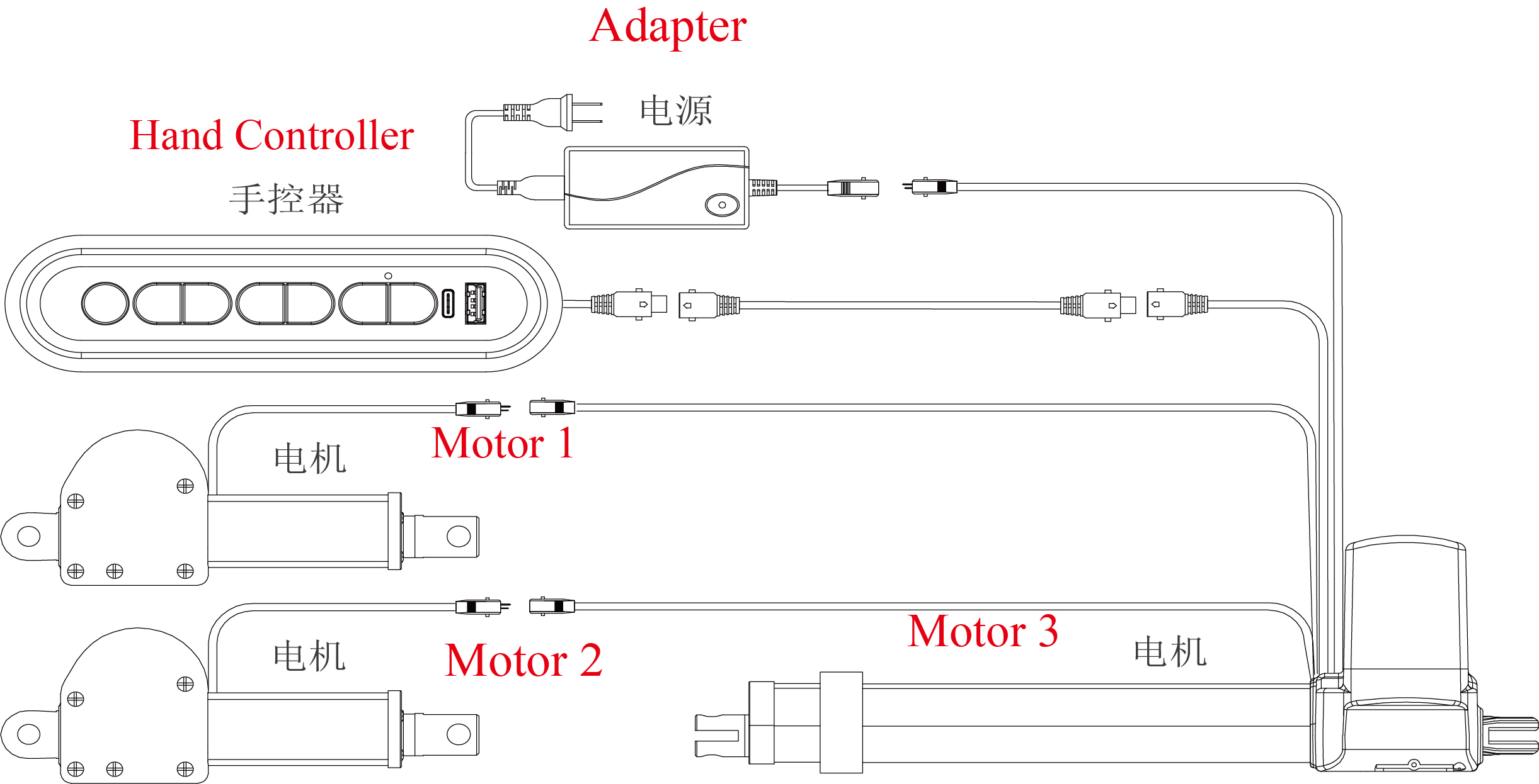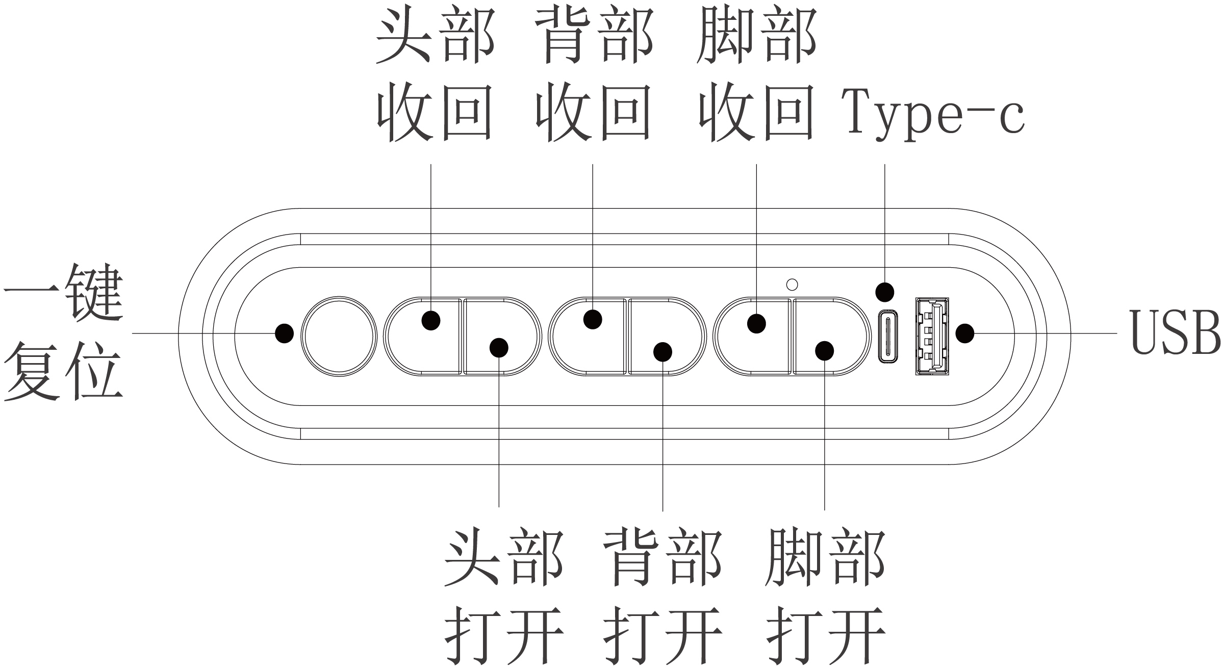 1.脚部打开: 长按按键,电机打开直到行程最大,松开停止动作。7.一键复位:长按按键,所有电机收回直到行程最小,松开停止动作。