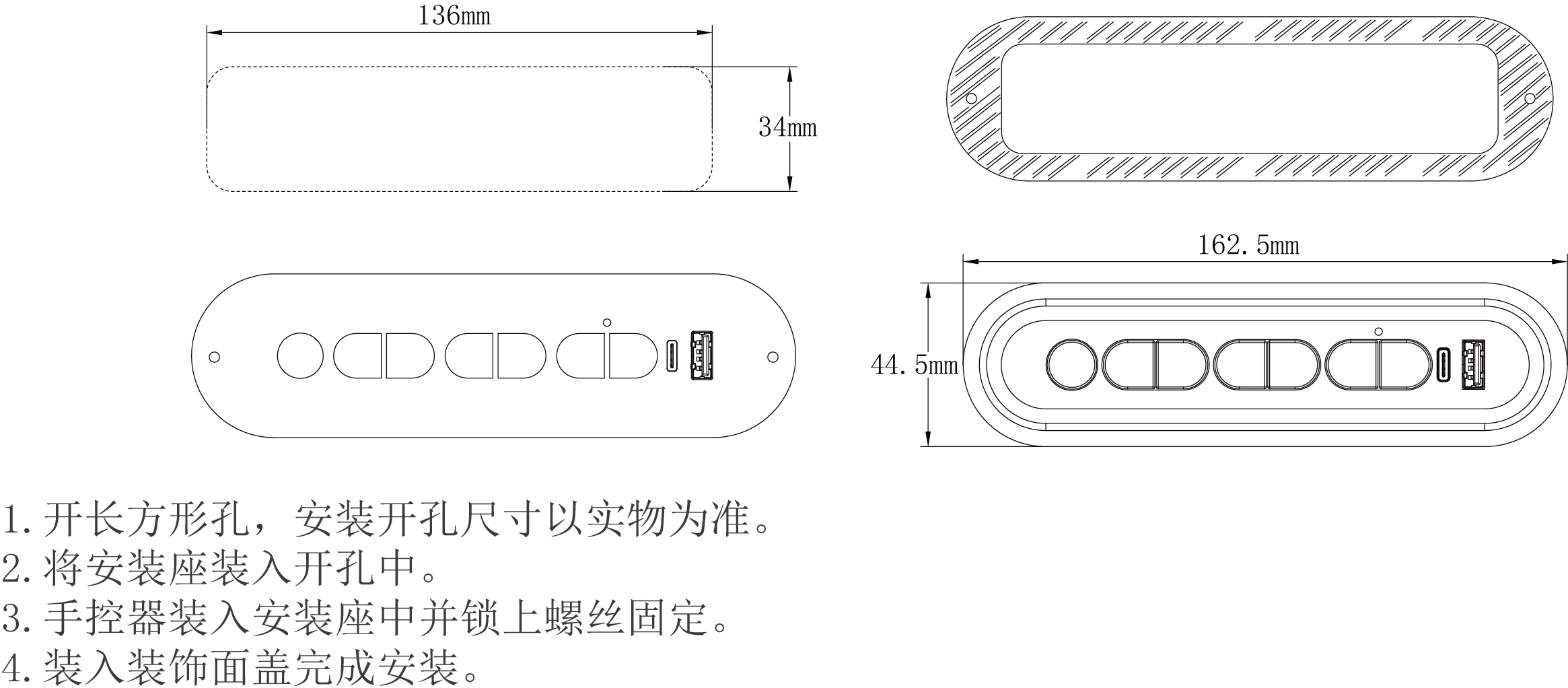 1. 开长方形孔,安装开孔尺寸参考安装图。