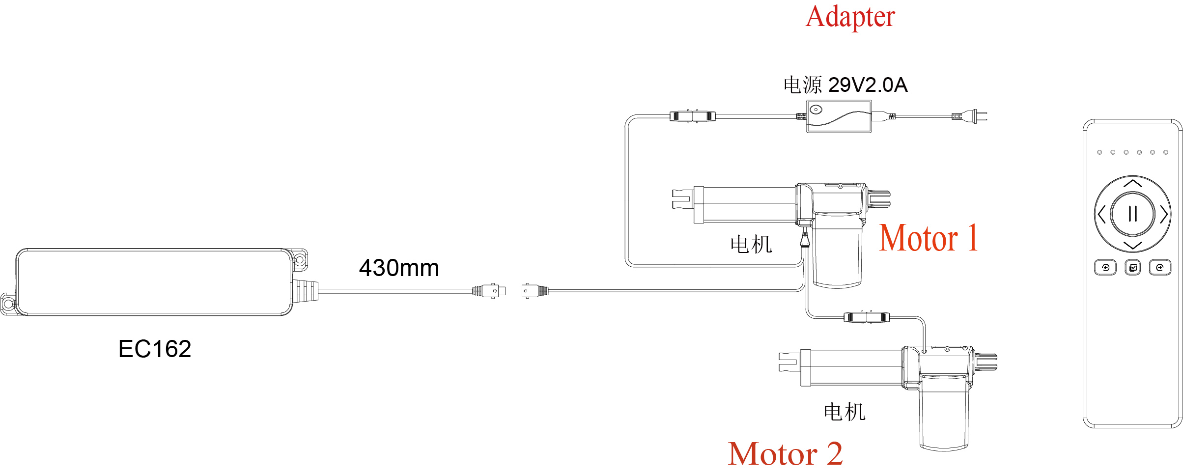 遥控器和控制盒配对:同时长按电机2打开和电机2收回两按键遥控器指示灯闪烁进入配对,此时给控制盒上电,遥控器指示灯停
