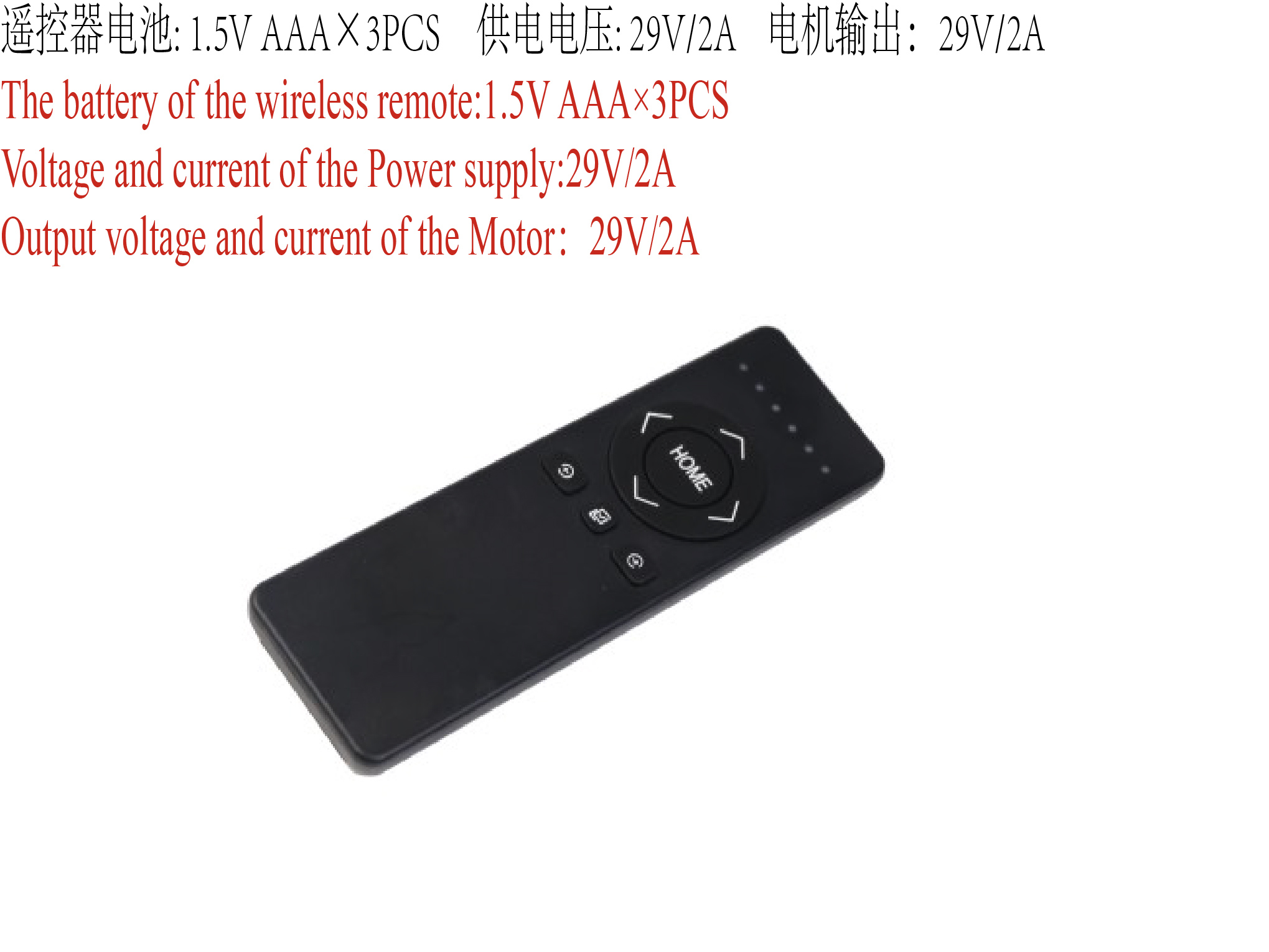 遥控器和控制盒配对:同时长按电机2打开和电机2收回两按键遥控器指示灯闪烁进入配对,此时给控制盒上电,遥控器指示灯停